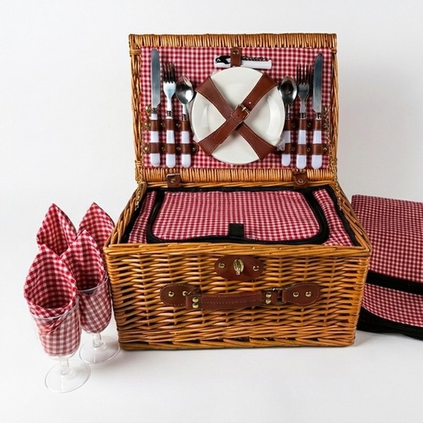 - Le panier de pique-nique de luxe 21 pièces se compose de: 4 assiettes en céramique blanche (Ø 17 cm) élégantes et lavables au lave-vaisselle, 4 gobelets réutilisables légers et incassables, 4 sets de couverts complets en acier inoxydable (couteau, fourchette, cuillère) avec manches blancs, 4 serviettes assorties (31 x 31 cm), 1 décapsuleur en acier inoxydable avec un manche blanc élégant et 1 grande couverture de pique-nique imperméable (128 x 146 cm)