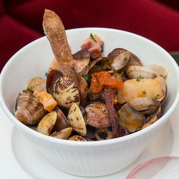 Gefrituurde vismix, inktvis, mayonaise van Taggiasche olijven