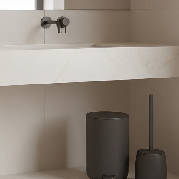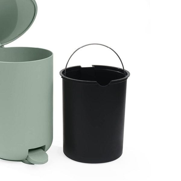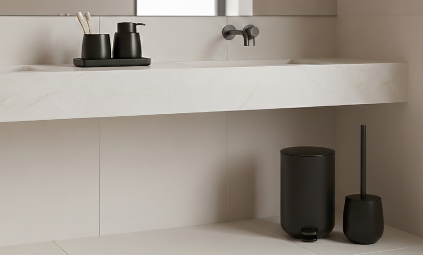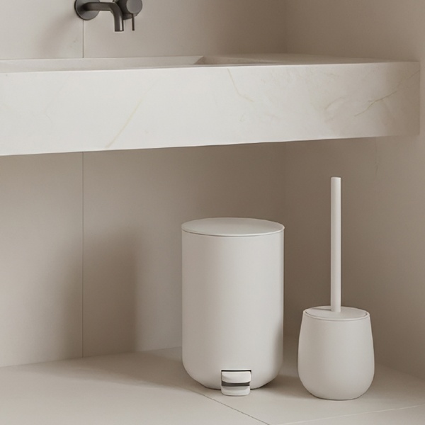 • Poubelle à ouverture par pédale pour une utilisation sans contact, brosse de toilettes avec récipient hygiénique et accessoires ergonomiques conçus pour une utilisation quotidienne pratique et fonctionnelle.