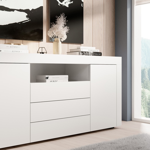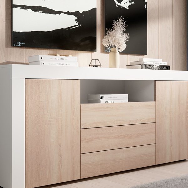 Un buffet harmonieux et moderne qui joue avec les volumes pour offrir à la fois du style et du rangement dans un salon contemporain.