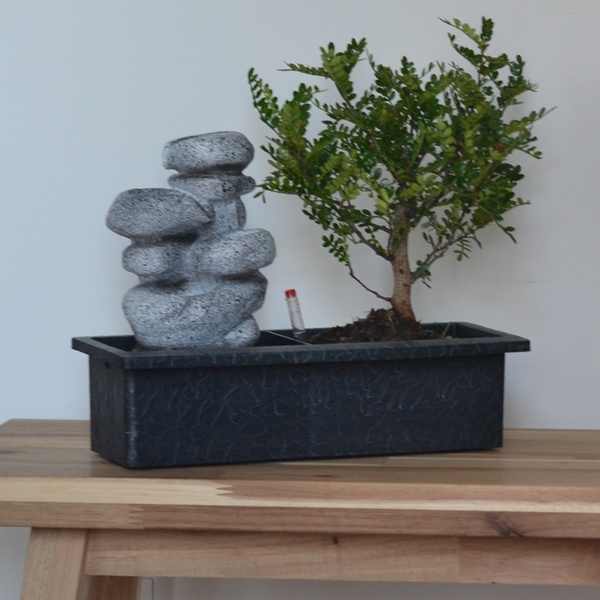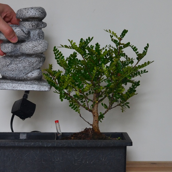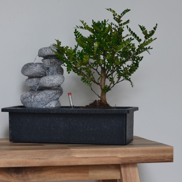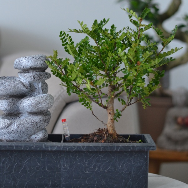 Deze 5 jaar oude bonsai is gekweekt in Zuid-China en komt met een waterniveaumeter die aangeeft wanneer water moet worden gegeven.