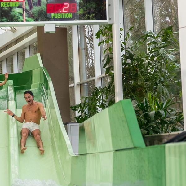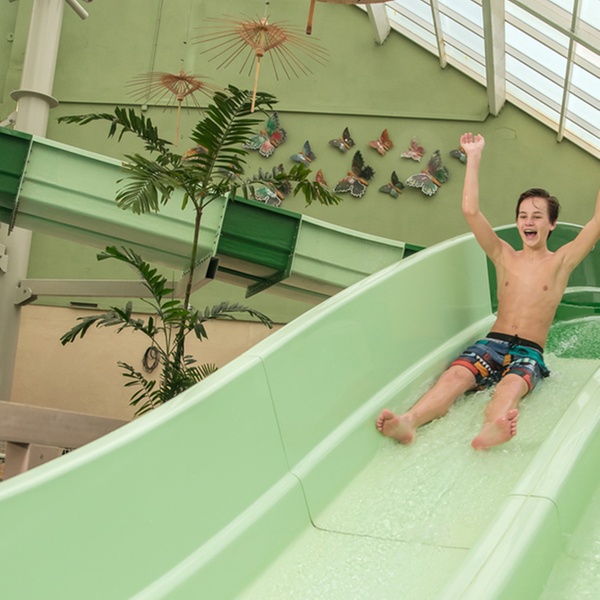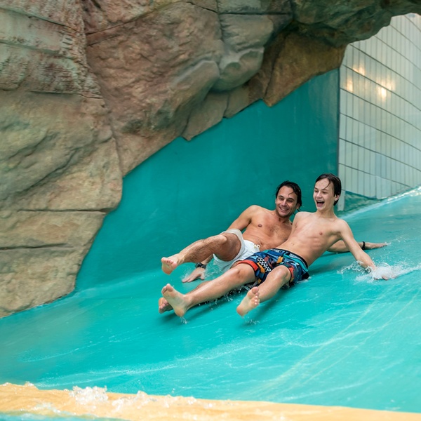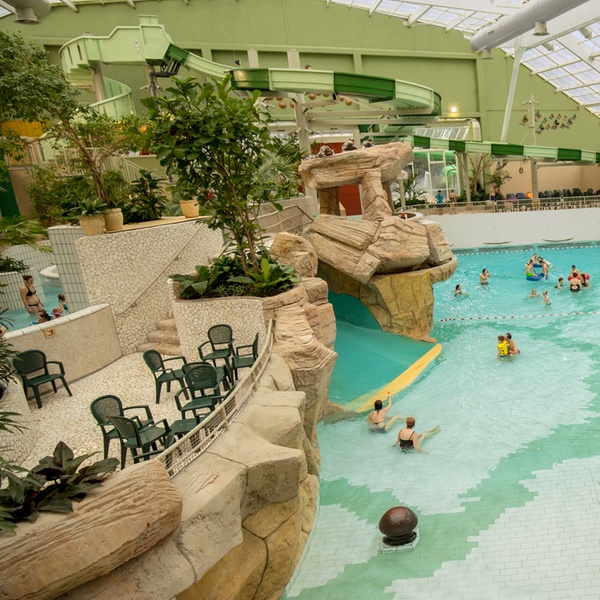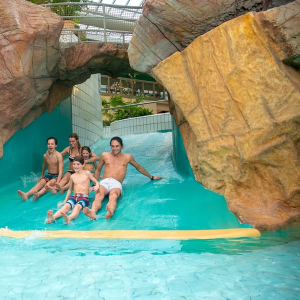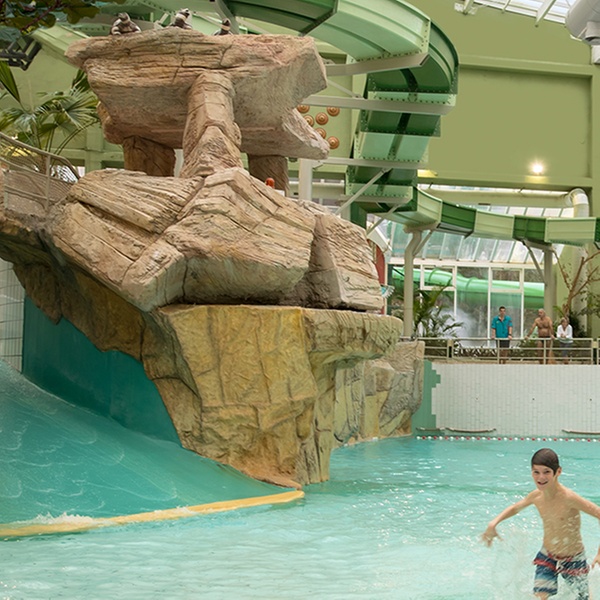 Un parc aquatique entièrement couvert avec toboggans, piscine à vagues et à courants, bassin pour bébés et enfants...