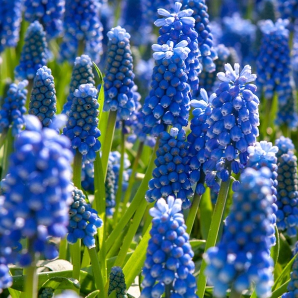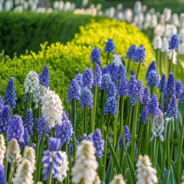 - Mélange de différentes espèces de muscari aux fleurs bleues et blanches éclatantes.