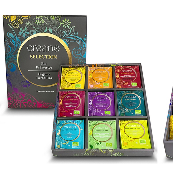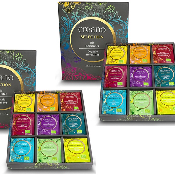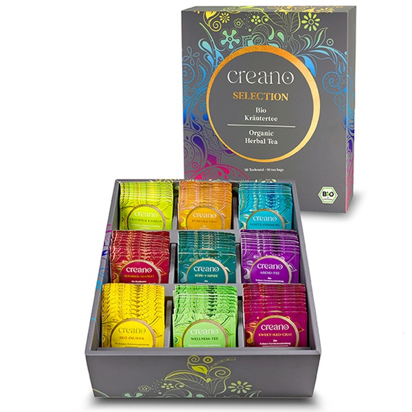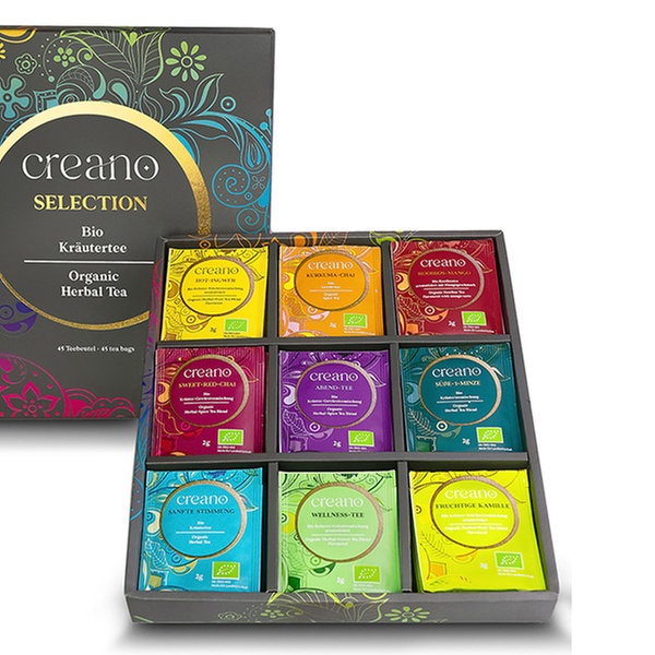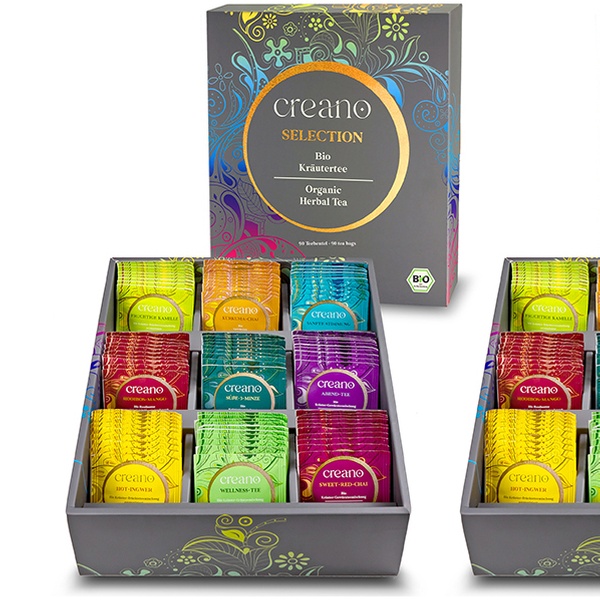- Neuf mélanges biologiques : Fruity Harmony, Hot Ginger, Turmeric Chai, Rooibos Mango, Sweet Red Chai, Evening Tea, Sweet Mint, Gentle Mood, Wellness Tea