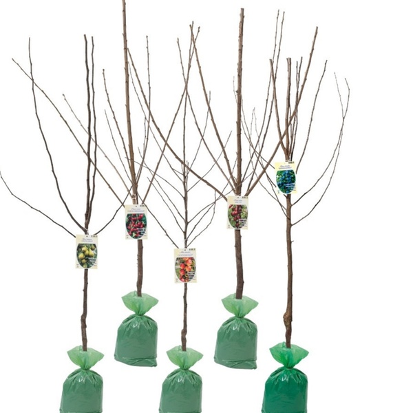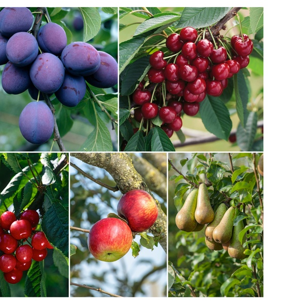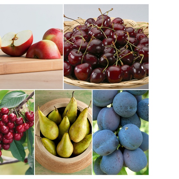 Cet ensemble comprend 5 arbres fruitiers de pommier, poirier, cerisier doux et acide, et prunier, qui peuvent donner des fruits dès 1 an