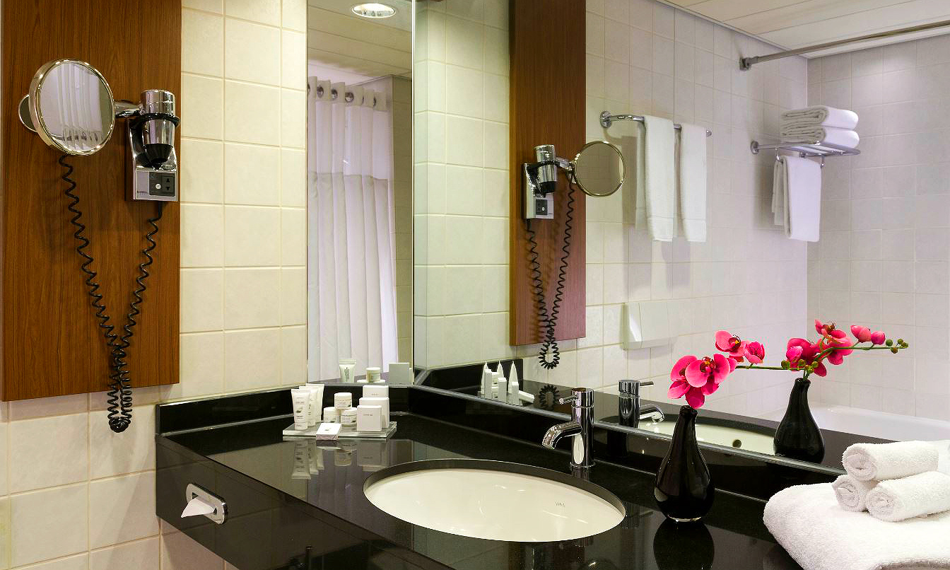 * De 242 comfortabele hotelkamers bieden een eigen badkamer met bad, een bureau en koffie- en theevoorzieningen.