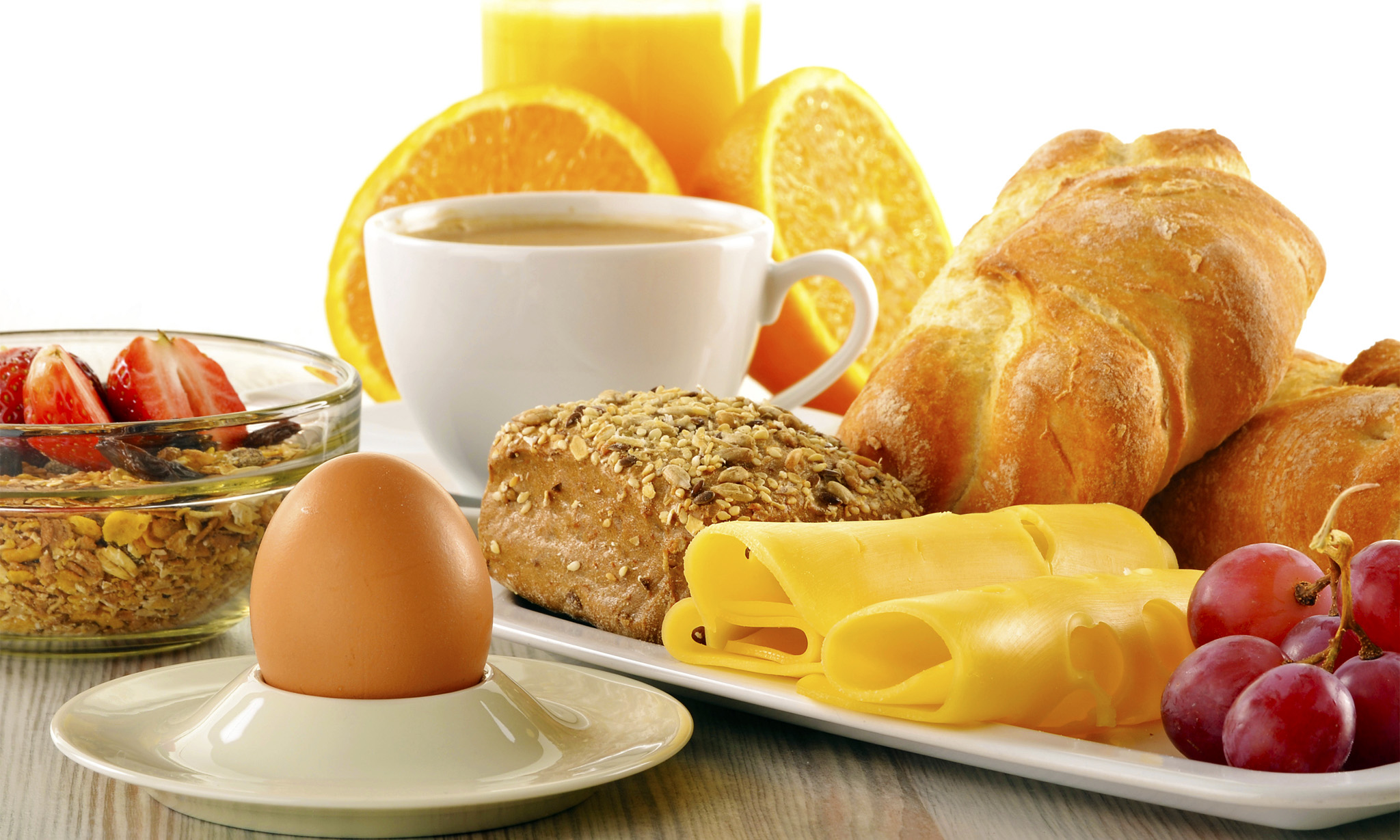 Het ontbijt, geserveerd in buffetvorm, bestaat onder meer uit verschillende soorten brood, koffiekoeken, vers fruit, yoghurts en charcuterie.