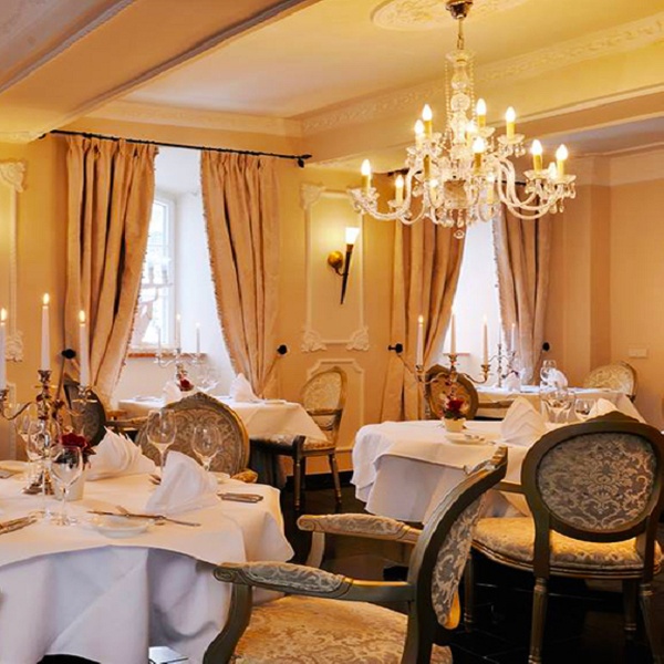 Au restaurant de l’hôtel, les convives peuvent prendre un dîner romantique et boire un bon vin à la lumière des chandelles. Le petit déjeuner avec du pain fraîchement cuit et du saumon fumé est servi dans le Burghaus.