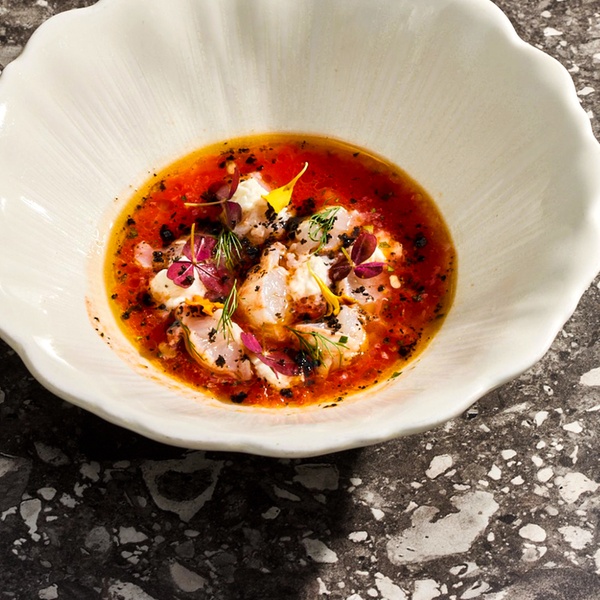 Handgepelde grijze garnalen / bio coeur de boeuf tomaat / burrata / citrus / prei-olie