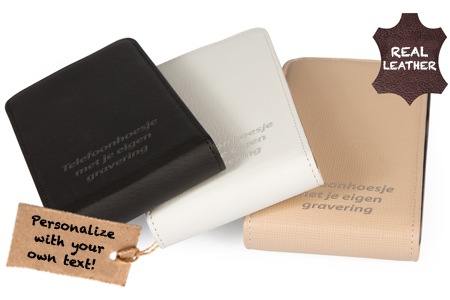 Laat je naam of een persoonlijke boodschap graveren in een lederen hoesje voor je smartphone. De bescherming is leverbaar in verschillende kleuren, maten en modellen en is daardoor geschikt voor bijna alle smartphones zoals iPhone, Samsung Galaxy, Blackberry, HTC, Nokia en vele anderen.