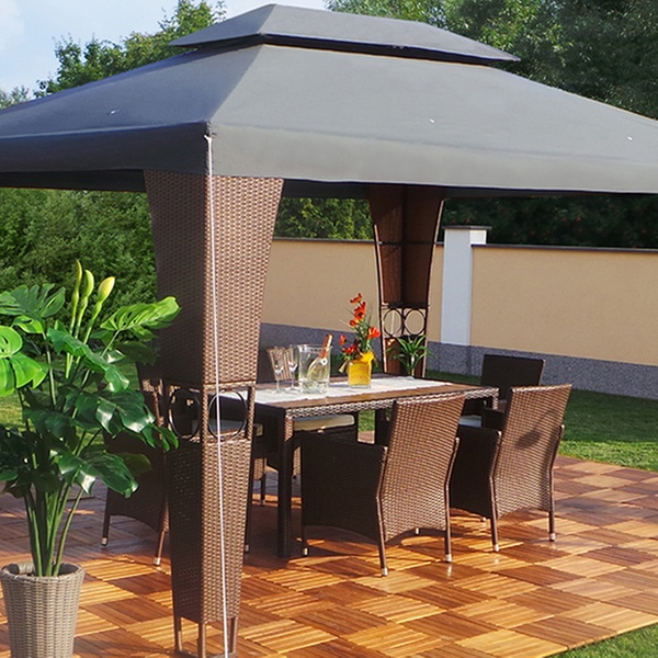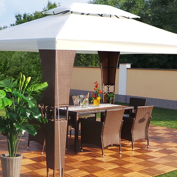 - € 299.90 voor een rattan-effect gazebo in het crème/bruin of antraciet/bruin (28% korting)