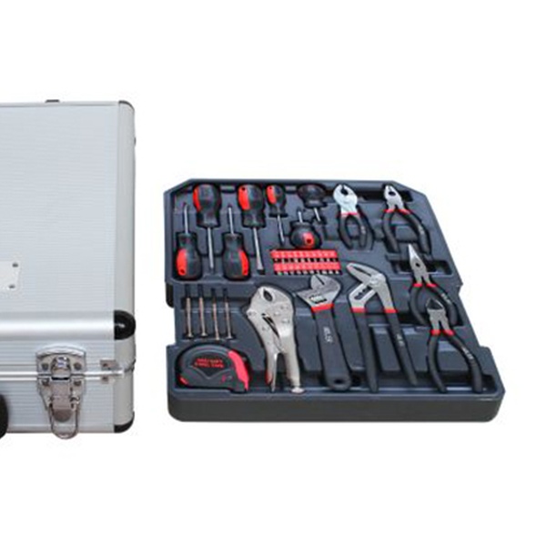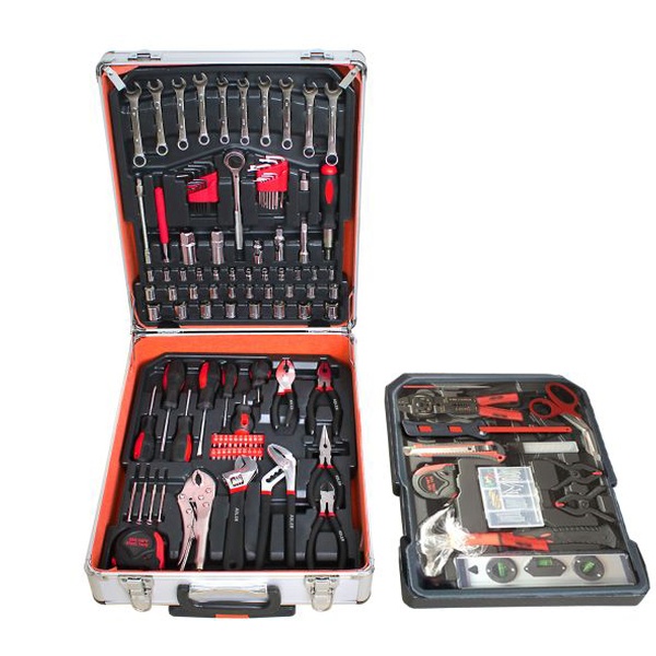 Deze professionele gereedschapset wordt geleverd met o.a tangen, moersleutels, schroevendraaiers, complete inbussleutelset en een klauwhamer
