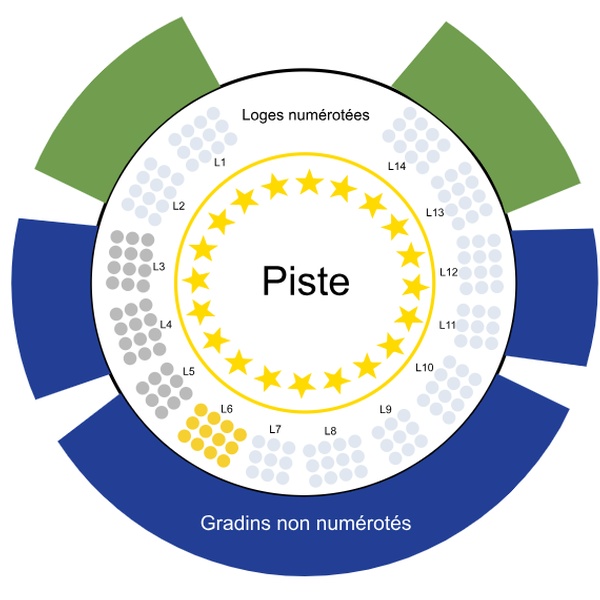 - 💺 Place en gradin de côté (gradin en vert) ou de face(gradin en bleu)