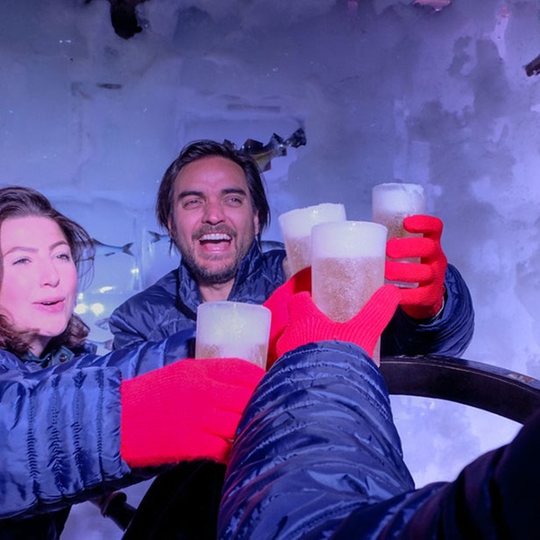 - L’expérience inclut trois boissons : une à savourer dans la taverne avec votre jeton doré (cocktail, bière, vin, café, soft, etc.) et deux à déguster dans le bar glacé grâce à vos jetons argentés (bière, shot ou jus d’orange). Le tout servi dans des verres sculptés… entièrement en glace !