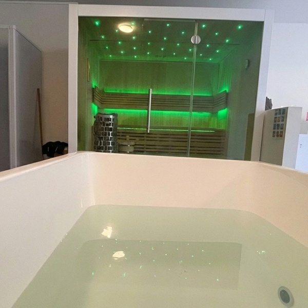 - Combo-sessie sauna en ijsbad (55 min): ervaar ultieme contrasttherapie door zo vaak je wilt af te wisselen tussen de warmte van de sauna en de kou van het ijsbad voor totale ontspanning