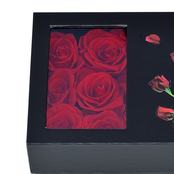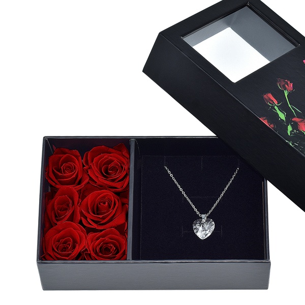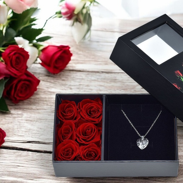 Cette boîte à bijoux, ornée de six roses éternelles, est un écrin privilégié pour un cadeau à un être cher, avec un collier en forme de coeur