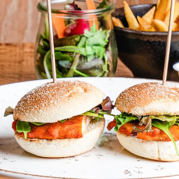 Jacques Rebel: spicy burger met huisgemaakte dressing, gesmolten cheddarkaas, rode ui, augurk, sla en kerstomaten