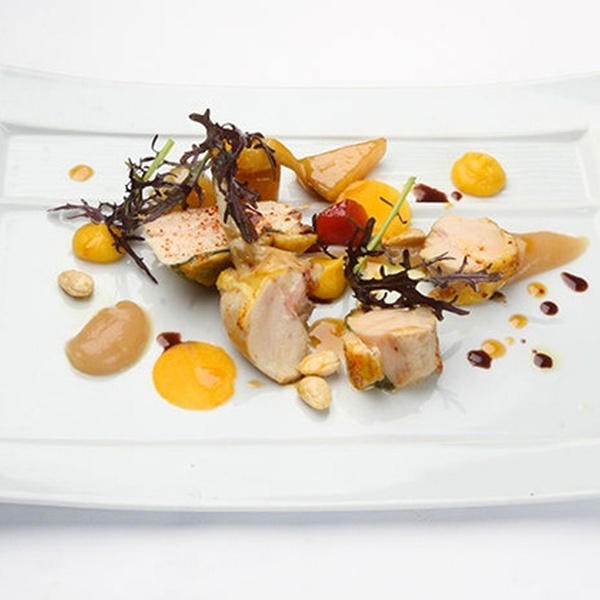 Volaille fermière de l'Ain farcie, texture de carotte et caviar d'aubergine
