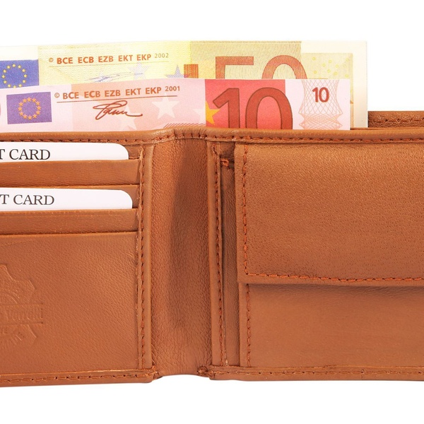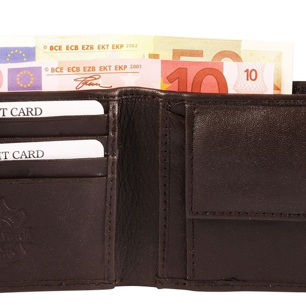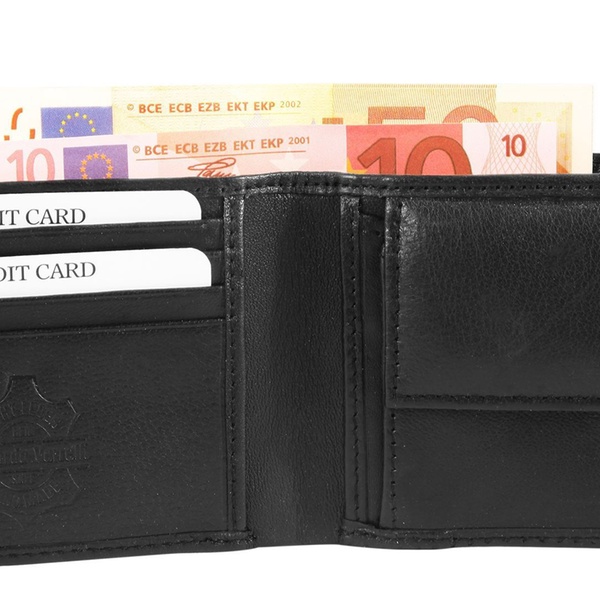 - Portefeuille : 2 compartiments à billets, 4 fentes pour cartes, 2 poches supplémentaires, 1 poche à monnaie avec bouton-pression sécurisé