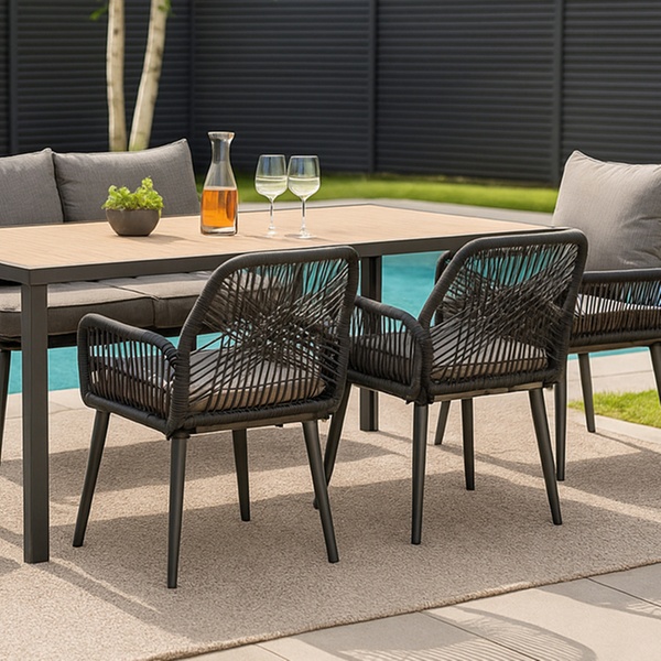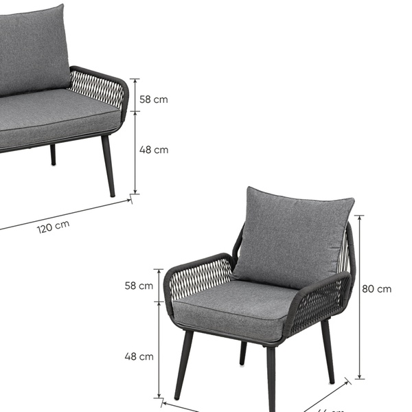 - Épaisseur des coussins : 10 cm pour les fauteuils et canapés, 7 cm pour les chaises