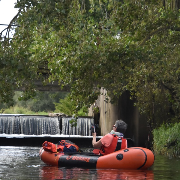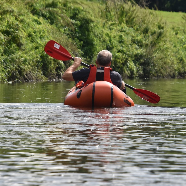 • Je wandelt met je opgevouwen raft tot aan het water, blaast ‘m op (gemakkelijk!) en peddelt je route