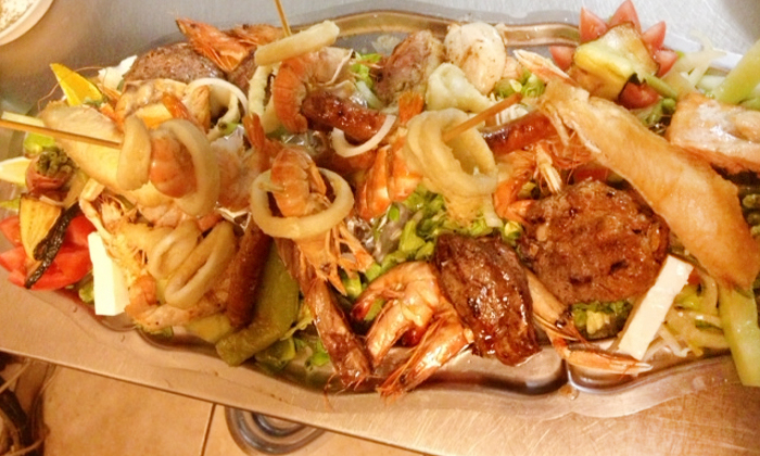 - Côtes d'agneau, merguez, filet de poulet, filet de bœuf, keftedes, gambas, langoustines, brochettes de scampis, calamars, filet de poisson du Nil