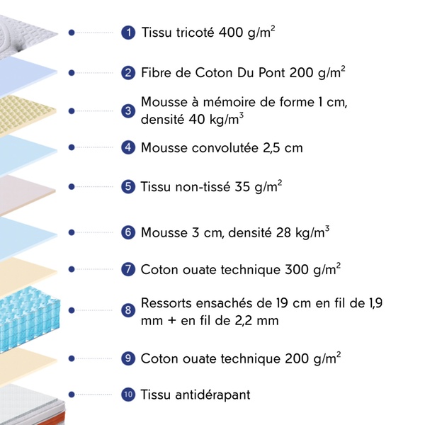 - 1 cm mousse mémoire de forme 40 kg/m³ pour un accueil moelleux incomparable et un confort maximal