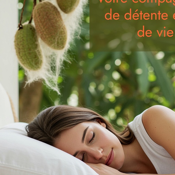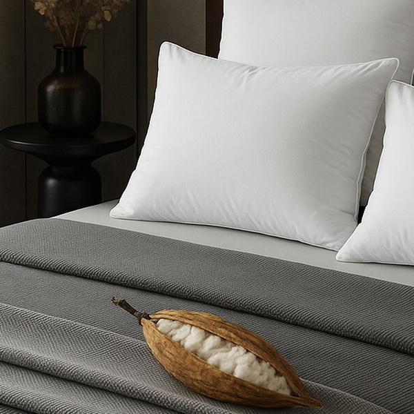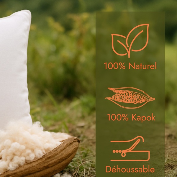 Oreiller en fibre de kapok 100 % naturelle, récoltée à partir des gousses de l'arbre de kapok, léger, hypoallergénique et biodégradable.