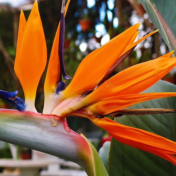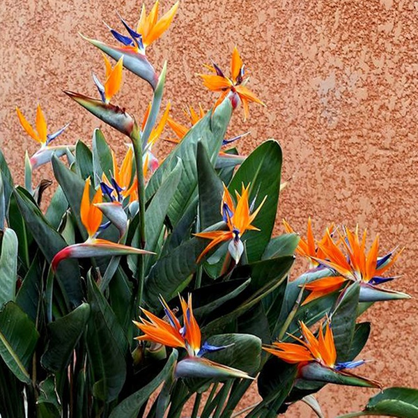Avec des fleurs orange vif et bleues, ces oiseaux de paradis Strelitzia Reginae prospèrent à la lumière vive et peuvent atteindre une hauteur de 2 mètres.