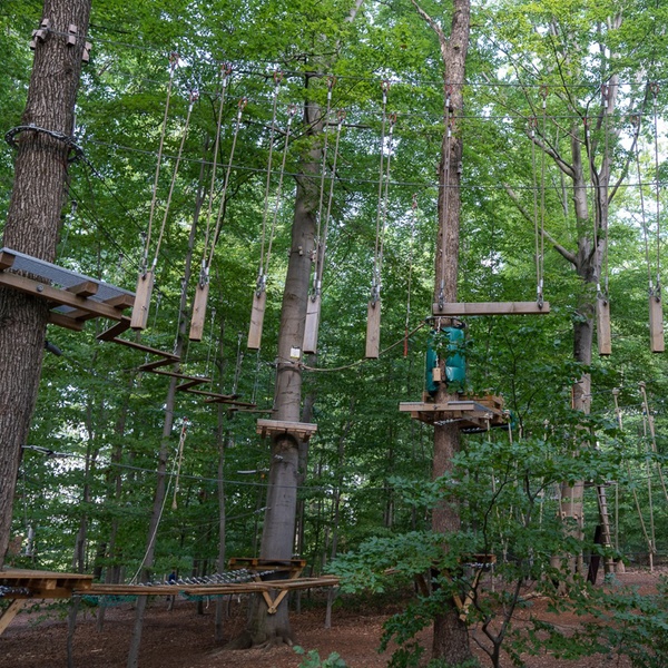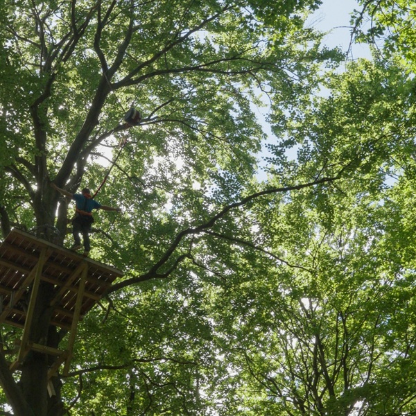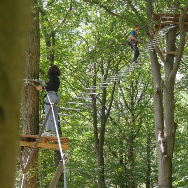 Accrobranche situé à plusieurs mètres de hauteur avec ligne continue afin de garantir une meilleure sécurité
