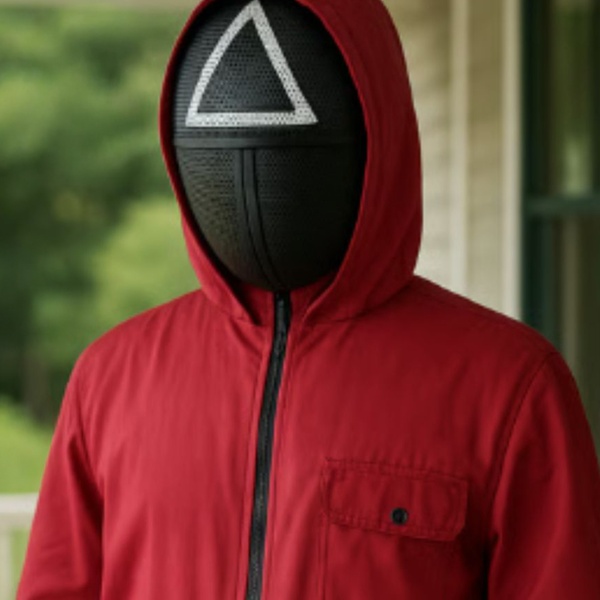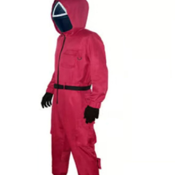 Ce costume de gardien de Squid Game en rouge à capuche offre un look saisissant et emblématique, parfait pour les fans de la série.