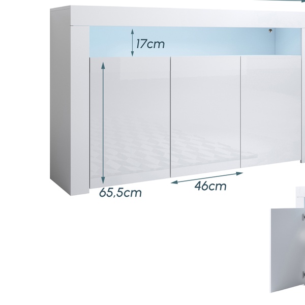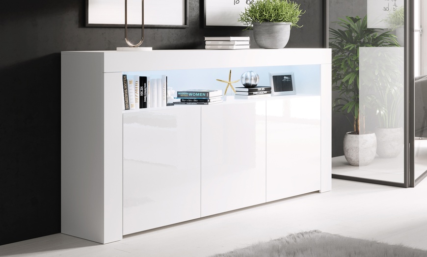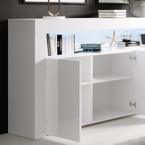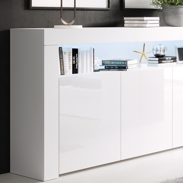 Illuminez votre intérieur avec ce buffet, doté d'un éclairage LED élégant et d'une finition brillante et contemporaine.